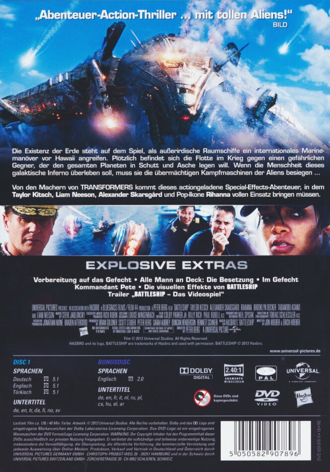 Auch wenn sehr US Lastig mit Militär (typisch) und sehr viel navypropaganda, ist es eine tolle visuelle Actionreiche Materialschlacht geworden. Toller Sound dazu. Und ich man muss nicht unbedingt Transformer Fan sein um dies zu mögen (habe persönlich nur 1 Transformer gesehen und der war gut und nicht mehr). kurz und knapp: Hirn ausschalten, zurücklehnen und 2h geniessen. PS: abspann anschauen oder 5 Min. vorspulen, sonst verpasst man was :-) Einziges Manko wie so oft bei der DVD die Exrtas: nicht mal der Trailer hat es geschafft, sondern nur ein lächerliches 54 Sekündchen Trailer über das Video Game von Battleship. Universal schämt euch!!!