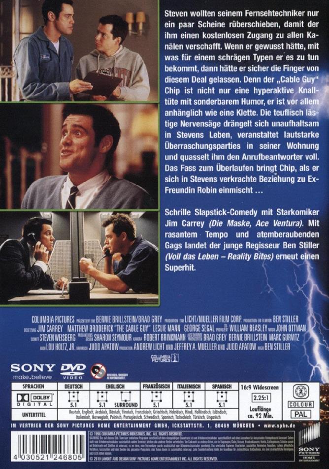 Steven wollte seinem Fernsehtechniker nur ein paar Scheine rüberschieben, damit der ihm einen kostenlosen Zugang zu allen Kanälen verschafft. Wenn er gewusst hätte, mit was für einem schrägen Typen er es zu tun bekommt, dann hätte er sicher die Finger von diesem Deal gelassen. Denn der "Cable Guy" Chip ist nicht nur eine hyperaktive Knalltüte mit sonderbarem Humor, er ist vor allem anhänglich wie eine Klette. Die teuflisch lästige Nervensäge drängelt sich unaufhaltsam in Stevens Leben, veranstaltet lautstarke Überraschungsparties in seiner Wohnung und quasselt ihm den Anrufbeantworter voll. Das Fass zum Überlaufen bringt Chip, als er sich in Stevens Beziehung zu Ex-Freundin Robin einmischt...