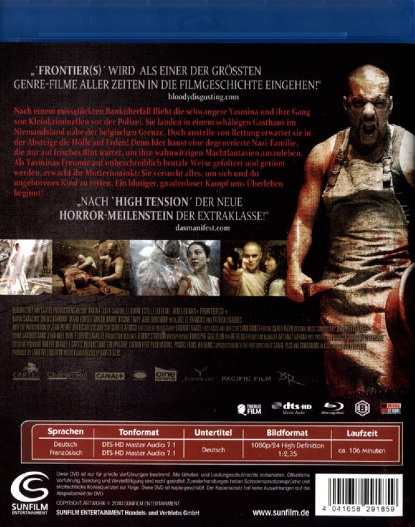 Frontier(s) hat Stil, ist spannend, krank und die Darsteller können auch überzeugen. Hat mich von der Stimmung und Spannung her an "Haute tension" erinnert. Wie und ob diese Version geschnitten ist, weiss ich nicht; habe die englische Version (uncut) gesehen und fand den Film einfach hammermässig und .... -