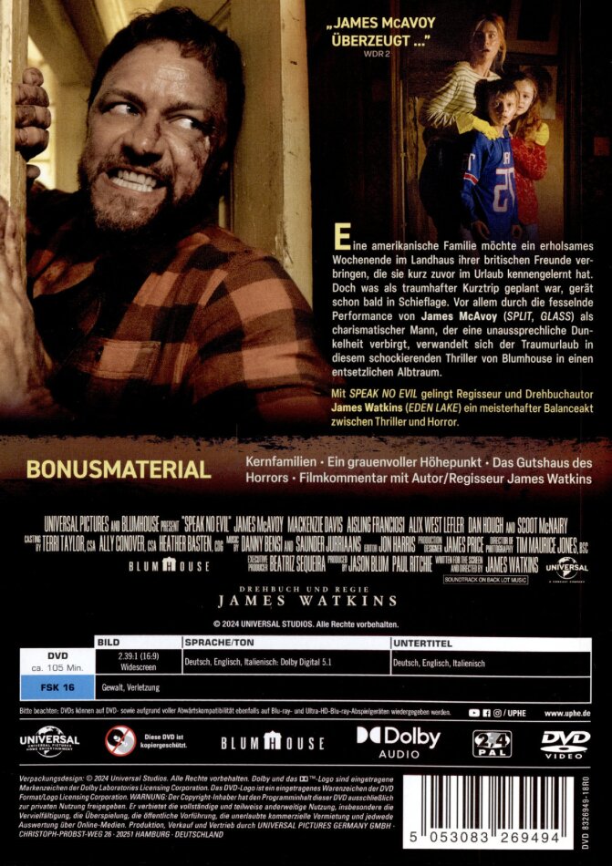 Eine amerikanische Familie möchte ein erholsames Wochenende im Landhaus ihrer britischen Freunde verbringen, die sie kurz zuvor im Urlaub kennengelernt hat. Doch was als traumhafter Kurztrip geplant war, gerät schon bald in Schieflage und wird zu einem verstörenden Albtraum. Mit SPEAK NO EVIL gelingt Regisseur und Drehbuchautor James Watkins (Eden Lake) ein meisterhafter Balanceakt zwischen Thriller und Horror.