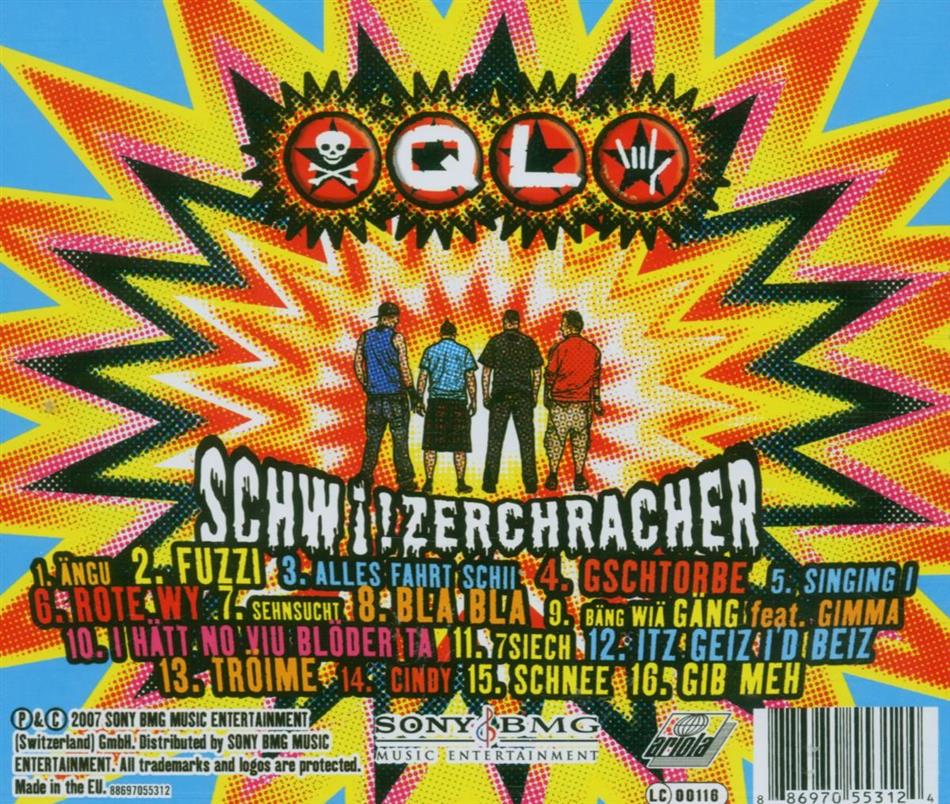 Doch QL können mehr! Definitiv! Auch diesmal wurde wieder ein englisch sprachiger Klassiker in schweizerische Gefilde versetzt, aus dem Motörhead-Klassiker ?Ace Of Spades? wurde ?Jetzt Geit?s I d Beiz?. Ein Motto, das bestens zu den partygeprüften Punks aus dem Seeland passt. Dass nicht immer brachial gerockt werden muss, um einem wohl bekannten Mundartlied ein neues Gesicht zu verpassen, beweisen QL mit ihrer karibisch inspirierten Version der Rumpelstilz-Nummer ?Rote Wy?. Vertrackte Rhythmuswechsel, Loops und Studiospielereien lassen aufhorchen, soviel Experimentierfreudigkeit hätte kaum einer den lustigen Punks zugetraut! Auch ?Gib meh?, die offizielle Hymne zur Snowboard-WM in Arosa, ist kein QL-Song nach klassischem Strickmuster. Genau wie ?Alles fahrt Schii? wurde der Song von Roman Camenzind produziert. ?Gib meh? ist übrigens die erste Eigenkomposition von QL, die als Single erscheint. Aber es sind ganz klar auch die Eigenkompositionen, die den Charme von ?Schwiizerchracher? ausmachen, die gewohnt rotzig-rockig (beispielsweise ?Fuzzi?) oder in bisher ungehört balladesker Form (?Sehnsucht? oder ?Troime? wären als treffende Müsterli zu nennen) daher kommen. Wieso nicht, denn auch Punks dürfen Gefühle zeigen. Aber noch verblüffender ist die Tatsache, dass die Eigenkompositionen - und dazu gehört mit ?Bäng wiä gäng? auch eine Zusammenarbeit mit dem Bündner Rap-Provokatuer Gimma ? den Covers in nichts nach stehen. Nicht umsonst heisst das Motto auch diesmal wieder: Alles Knüller, keine Füller! Ach ja, auch gesanglich bieten QL den FreundInnen vokalistischer Schmankerl einiges, die Chörli sitzen wie gewohnt perfekt! Demnächst auch wieder live zu überprüfen, wenn Pät, Tosi, Stämpf und Sägi mit den neuen ?Schwiizerchrachern? zur schweisstreibenden Party laden.