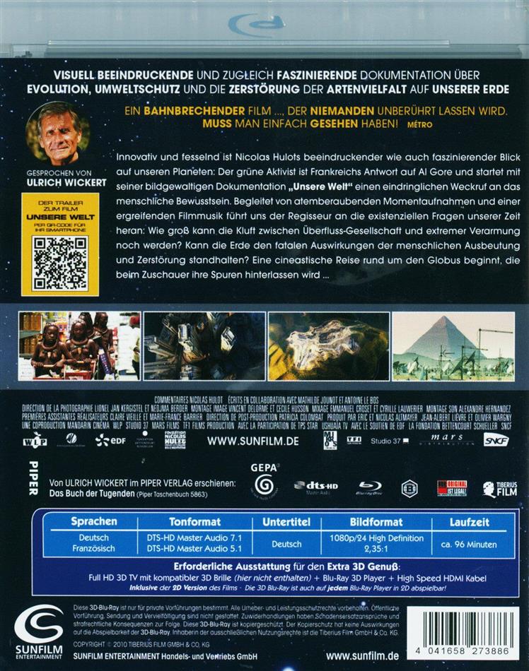 Innovativ und fesselnd ist Nicolas Hulots beeindruckender wie auch erschreckender Blick auf unseren Planeten: Der grüne Aktivist ist Frankreichs Antwort auf Al Gore und startet mit seiner bildgewaltigen Dokumentation "Unsere Welt" einen eindringlichen Weckruf an das menschliche Bewusstsein. Begleitet von atemberaubenden Momentaufnahmen und unkonventionellem Score führt uns der Regisseur an die existenziellen Fragen unserer Zeit heran: Wie gross kann die Kluft zwischen Überfluss-Gesellschaft und extremer Verarmung noch werden? Kann die Erde den fatalen Auswirkungen der menschlichen Ausbeutung und Zerstörung standhalten? Eine cineastische Reise rund um den Globus beginnt, die ihre Spuren hinterlassen wird...