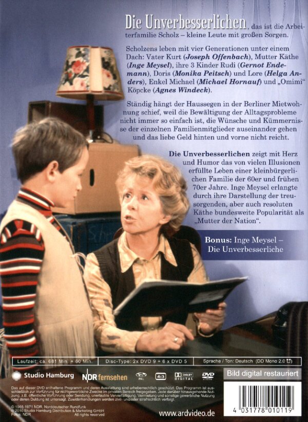 Die Unverbesserlichen, das ist die Arbeiterfamilie Scholz - kleine Leute mit großen Sorgen. Scholzens leben mit vier Generationen unter einem Dach: Vater Kurt, Mutter Käthe, ihre 3 Kinder Rudi, Doris und Lore, Enkel Michael und 'Omimi' Köpcke. Ständig hängt der Haussegen in der Berliner Mietwohnung schief, weil die Bewältigung der Alltagsprobleme nicht so einfach ist, die Interessen der einzelnen Familienmitglieder auseinander gehen und das Geld hinten und vorne nicht reicht. Die Unverbesserlichen zeigt ungeschönt und realitätsnah den Alltag einer kleinbürgerlichen Familie der 60er und früher 70er Jahre. Inge Meysel erlangte durch ihre Darstellung der gluckenhaften und resoluten Käthe bundesweite Popularität und den Beinamen 'Mutter der Nation'.