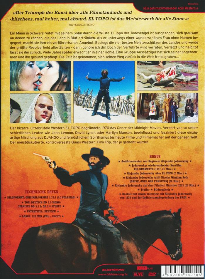 Eine einsahme gestahlt zieht durch die wüste. Hinter ihm schleppt sich ein Kind durch den heissen sand. El Topo, Gott und Django in einer Person, fordert die Götter der wüste zu einem Duell. Endlich ist eines der wohl am meisten verachteten meisterwerke auf DVD erschienen. El Topo nimmt den Zuschauer mit auf eine blutgetränkte reise. Der amoklauf von El Topo am ende des films setz dem ganzen einen finalen grabstein auf. Neben Santa Sangre der beste film von Jodorowski.