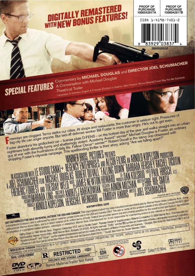 Genialer Thriller mit witzigen und teilweise deftigen Dialogen. Der Film schafft es, dass man auf der Seite von Michael Douglas steht, obwohl er je länger der Film dauert gegen das Gesetz verstosst. Jedem von uns sind sicher schon einige Szenen aus dem Film passiert (Münz wechseln, Telefonkabine, Frühstück usw.)