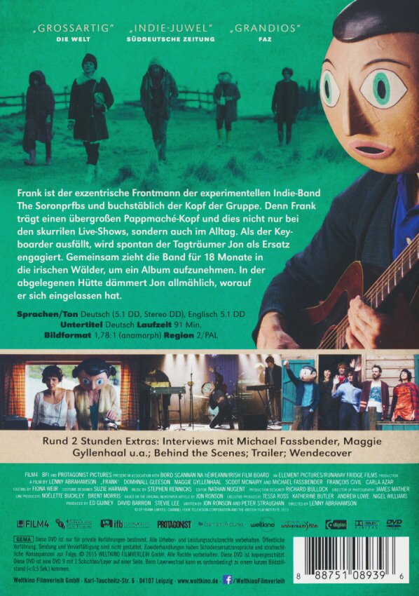 Frank ist der exzentrische Frontmann der experimentellen Rockband Soronprfbs und buchstäblich der Kopf der Band. Denn Frank trägt ständig einen übergrossen Pappmaché-Kopf auf seinen Schultern und dies nicht nur bei den skurrilen Live-Shows, sondern auch im Alltag. Nicht mal die Bandmitglieder haben je sein Gesicht gesehen. Als der Keyboarder ausfällt, engagiert Frank spontan den Tagträumer Jon als Ersatz. Und obwohl der erste gemeinsame Auftritt zum Desaster verkommt, darf der Debütant bleiben. Hochmotiviert zieht Jon mit der Band in die irischen Wälder, um ein Album aufzunehmen. In der abgelegenen Hütte dämmert ihm allmählich, worauf er sich eingelassen hat.