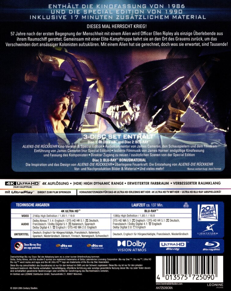 | Ton | Deutsch (Dolby Digital 4.1), Deutsch (DTS HD HR 5.1), Englisch (Dolby Atmos 7.1.4), Englisch (DTS HD Master Audio 2.0), Französisch (DTS HD HR 5.1), Italienisch (Dolby Digital 5.1), Spanisch (Dolby Digital 5.1) |