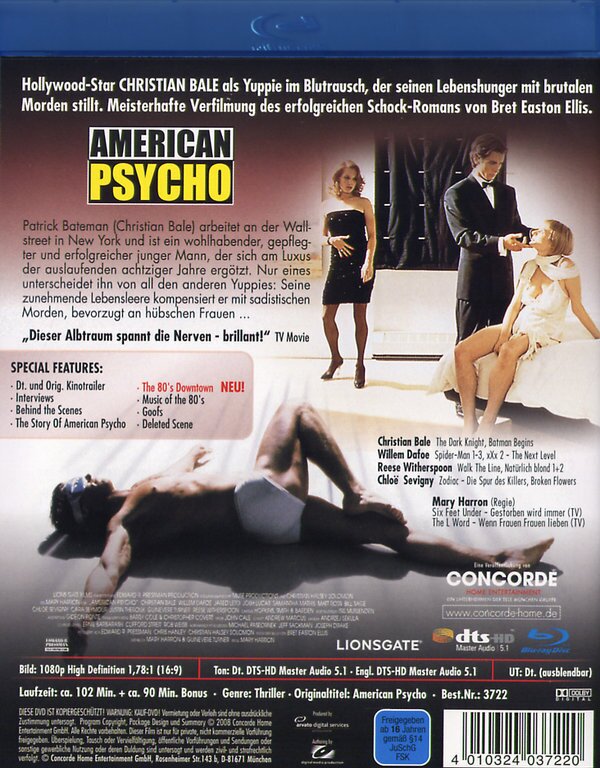 Das Buch ist um Welten perverser und härter aber unter dem Aspekt betrachtet das hier ein Film für das grosse Publikum realisiert werden musste wurde glaube ich für den Film fast das Optimum herausgeholt aus dem Stoff. Es geht hier nicht um vordergründige Effekte und möglichst viel Blut. Vielmehr geht es um die Darstellung des amerikanischen Traums aus der Sicht eines völlig kranken Psychopathen. Das ist meiner Meinung nach glänzend gelungen und Bale gibt einen grossartigen Patrick Bateman ab. Sehenswert!