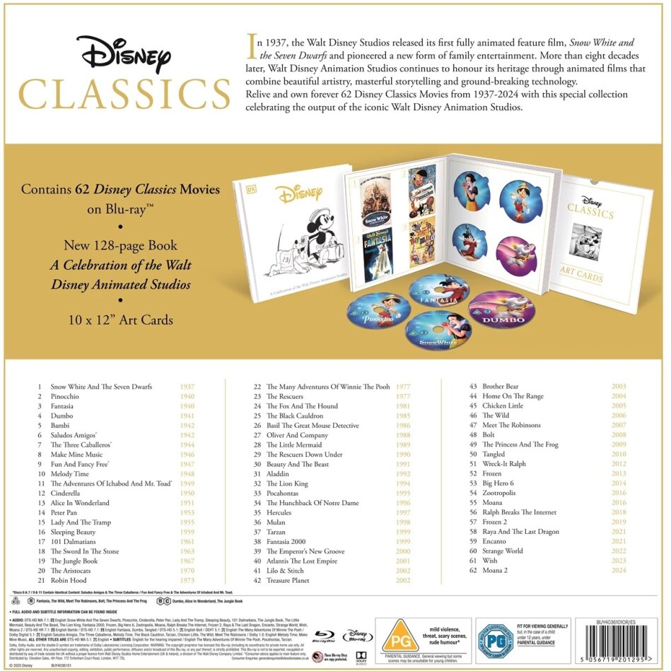 In 1937, the Walt Disney Studios released its first fully animated feature film, Snow White and the Seven Dwarfs, and pioneered a new form of family entertainment. More than eight decades later, Walt Disney Animation Studios continues to honour its heritage through animated films that combine beautiful artistry, masterful storytelling and ground-breaking technology. Relive & own forever 62 Disney Classics from 1937-2024 with this special collection celebrating the output of the iconic Walt Disney Animation Studios.