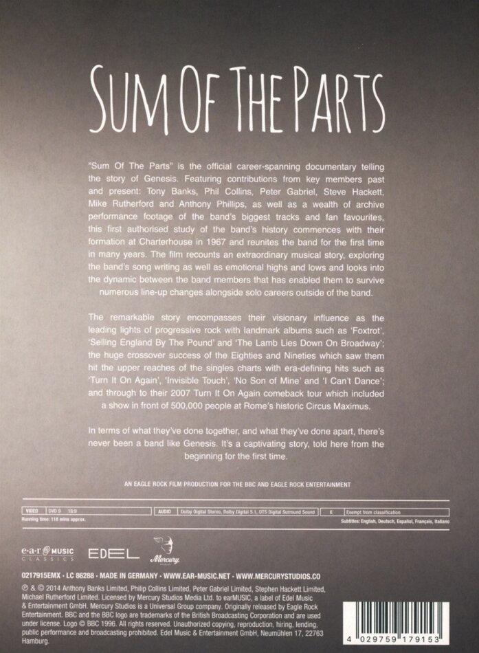 "Sum of the Parts" is the official authorized story of Genesis made with the full co-operation of the band members. As seen on SHOWTIME, It tells of the band's formation at Charterhouse (where Tony Banks, Peter Gabriel and Mike Rutherford were all pupils) in the late sixties and the release of their debut album "From Genesis to Revelation". The story then moves on through the departure of founder member Anthony Phillips and the arrival of Phil Collins and Steve Hackett in 1970 to form the 5-man line-up that established the band's career with albums such as "Foxtrot" and "The Lamb Lies Down on Broadway". Peter Gabriel's departure in 1975 and then Steve Hackett's in 1977 led to the release of the album "And Then There Were Three..." and a move towards shorter, more immediate songs. The eighties and nineties were triumphant decades for Genesis with hugely successful hit albums and singles around the world such as "Genesis", "Invisible Touch" and "We Can't Dance". at the same time as they were recording and performing with Genesis, Tony Banks, Phil Collins and Mike Rutherford (as Mike & the Mechanics) were all enjoying successful solo careers, as were departed members Peter Gabriel and Steve Hackett. "Sum of the Parts" explores the dynamics of the group that has enabled them to survive changes of line-up, see their musical direction steadily evolve and maintain both group and solo careers along with their enduring popularity as evidenced by their hugely successful 2007 reunion tour. Bonus features include over 30 minutes of additional interviews with the band members that were not included in the broadcast version.