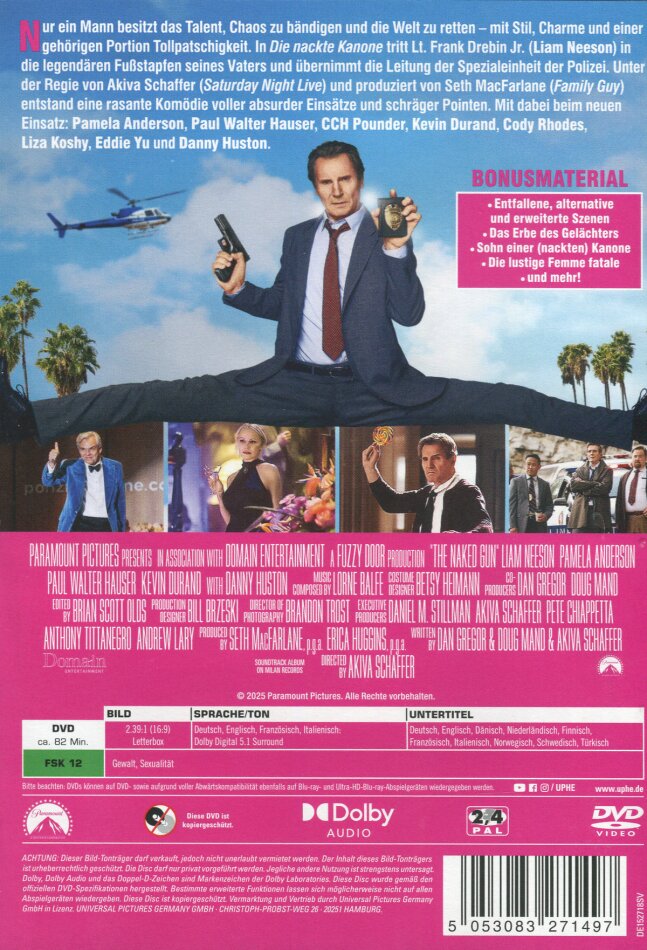 Nur ein einziger Mann verfügt über diese ganz besonderen Fähigkeiten… die Spezialeinheit der Polizei zu leiten und die Welt zu retten! In DIE NACKTE KANONE tritt Lt. Frank Drebin Jr. (Liam Neeson) in die Fussstapfen seines Vaters. Regie führte Akiva Schaffer (Saturday Night Live, Popstar: Never Stop Never Stopping). Produzent ist Seth MacFarlane (Ted, Family Guy). Ebenfalls beim neuen Einsatz dabei sind Pamela Anderson, Paul Walter Hauser, CCH Pounder, Kevin Durand, Cody Rhodes, Liza Koshy, Eddie Yu und Danny Huston.