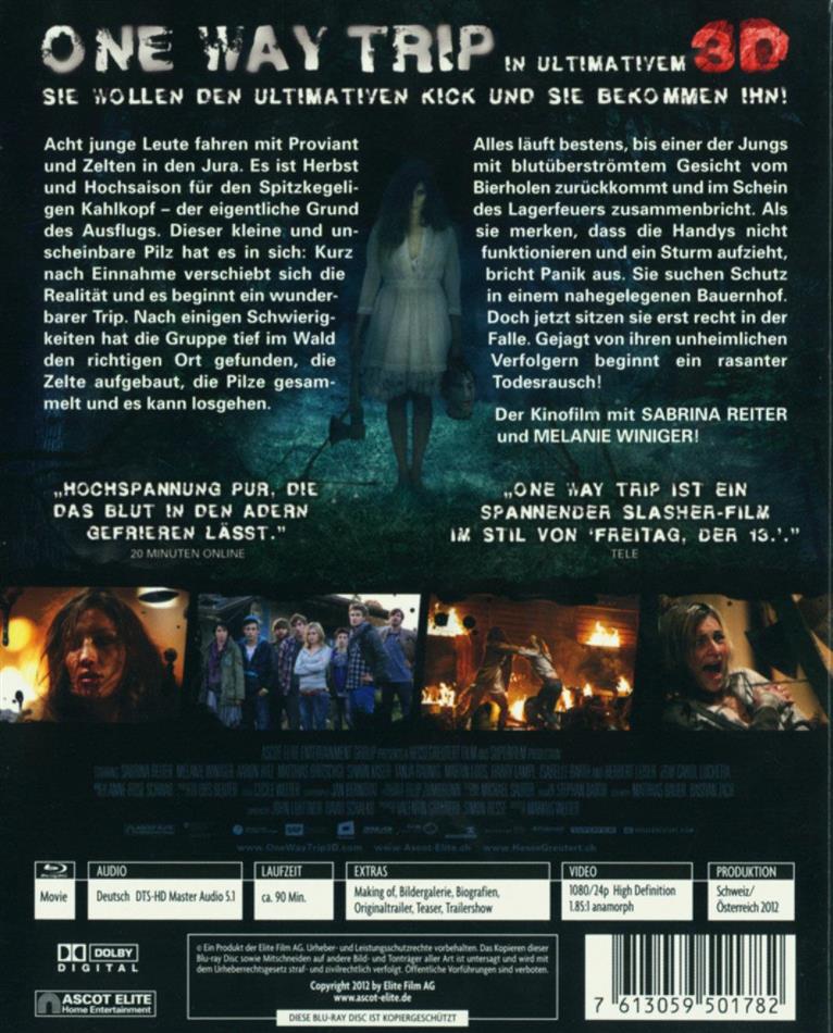 ...ist der Film zwar nicht viel aber dennoch etwas besser als der sehr langatmige und langweilige SHROOMS es war. Vielleicht lag es am 3D-Effekt, aber ONE WAY TRIP ist ganz klar kurzweiliger. Dazu ist er natürlich sehr vorhersehbar, vor allem für Genre-Kenner, und eher schlecht gespielt. Dabei spielte aber die Tatsache, dass alle krampfhaft versucht haben Hochdeutsch zu reden eine nicht unerhebliche Rolle, weswegen man da auch ein Auge zudrücken kann (nicht muss).