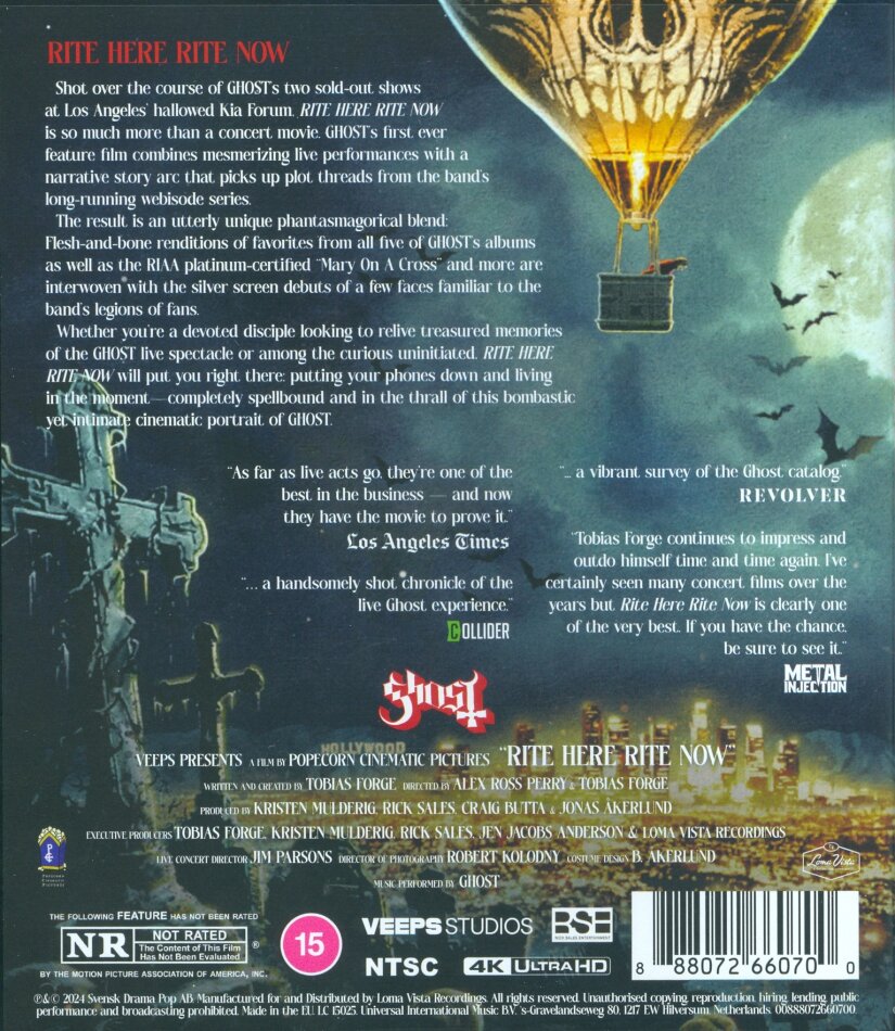 Ghost - "Rite Here Rite Now" [DVD] After a record-breaking Top 10 worldwide box office performance, an acclaimed global streaming premiere, and a #1 Soundtrack Album, GHOST now releases RITE HERE RITE NOW on DVD, Blu-ray, and 4K. This film blends live performances with cutaway sequences, immersing viewers in GHOST's renowned live rituals. It picks up plot threads from the band's long-running Chapters webisode series, featuring familiar faces interacting behind the scenes with Papa IV, whose future and fate rest with the Ministry. Concord Music Group; Loma Vista Recordings; Rock. Artist Hometown: Linköping, Sweden. [DVD] EXPLICIT