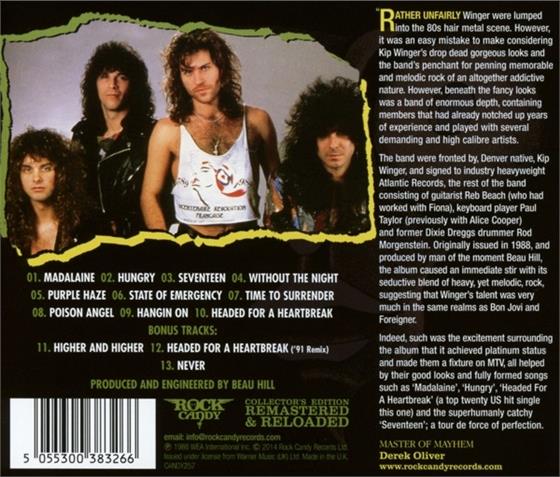 Kip Winger, ehemaliger Bassist von Alice Cooper mit seinem esten Winger-Album und was für eines!!!! Kip spielt nicht nur genial Bass sondern besitzt eine absolute hammer Stimme! Mit John Roth (Giant, Starship), Reb Beach (Whitesnake, Fiona), Rod Morgenstein (Dixie Dregs) hat er Mitmusiker erster Sahne! Ein geiles Rockalbum mit meinem absoluten Liebling Song 'Headed for a heartbreak'! Wunderbar! Kaufen!