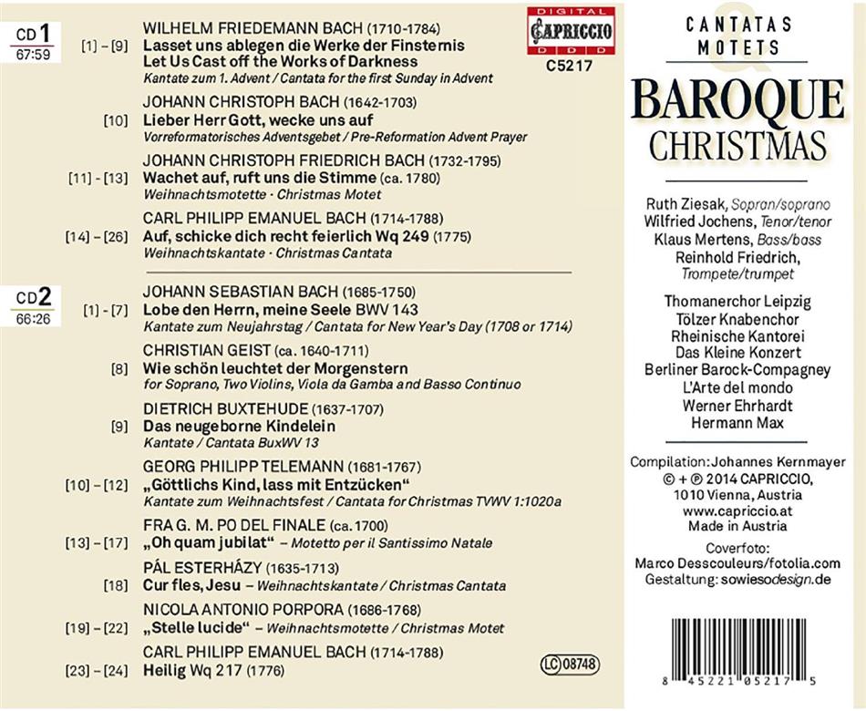 | Composers | Wilhelm Friedemann Bach (1710-1784), Johann Christoph Friedrich Bach (1732-1795), Carl Philipp Emanuel Bach (1714-1788), Johann Sebastian Bach (1685-1750), Christian Geist (1640-1711), Dietrich Buxtehude (1637-1707), Georg Philipp Telemann (1681-1767), Nicola Antonio Porpora (1686-1768) |