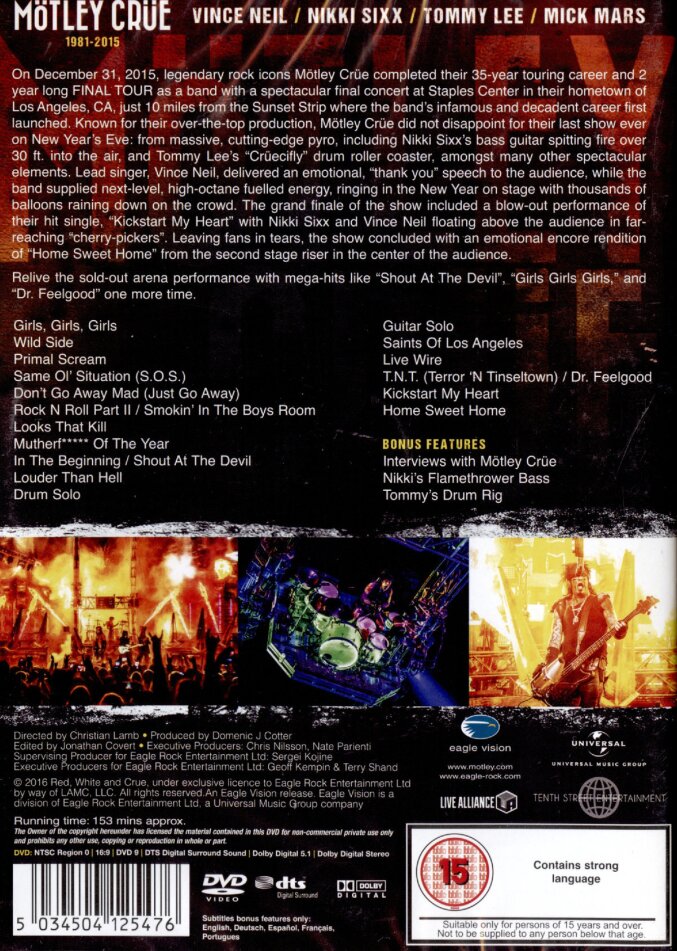 The last night of the ‘Final Tour’ is a must-have keep-sake for any Mötley Crüe fan. The spectacular final concert at Staples Center in their hometown of Los Angeles, CA, on New Year’s Eve in 2015, just a few miles from the Sunset Strip where the band’s infamous and decadent career first launched, can now be relived! The band thrilled the sold-out arena with performances of such mega-hits as “Kickstart My Heart,” “Girls, Girls, Girls,” “Home Sweet Home” and “Dr. Feelgood.” While not everyone was able to see their final show live, Crüe fans can now catch all the action in the comfort of their home. In addition to the epic concert footage, viewers will be treated to exclusive behind-the-scenes footage of the band’s last show ever.